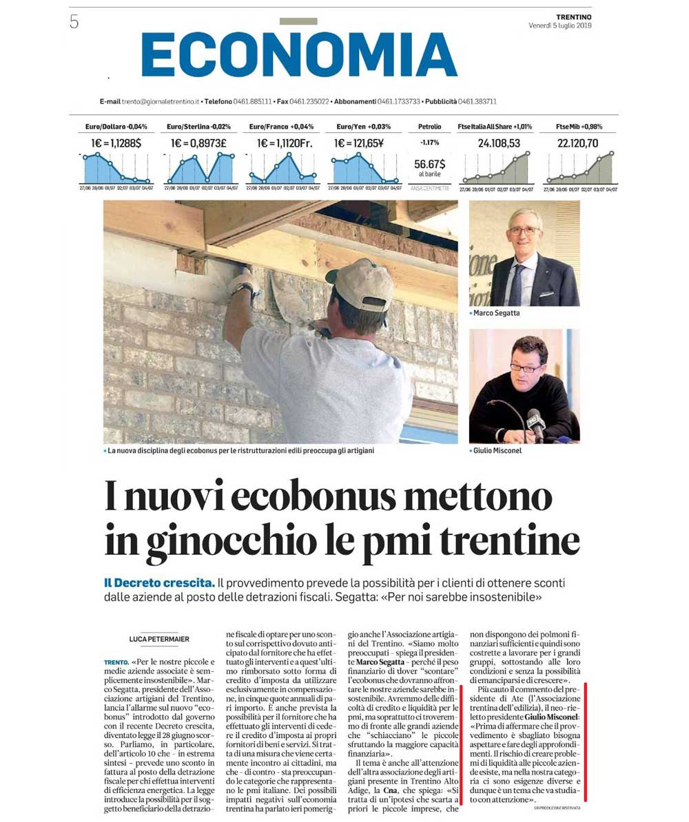 Articolo del “Trentino” del 5 luglio 2019