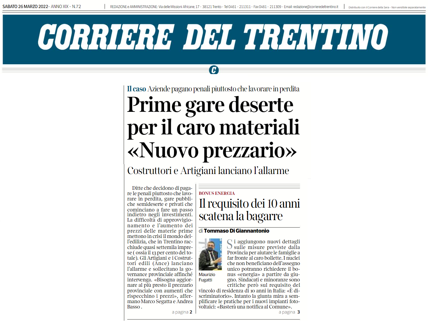 Articolo prima pagina del “Corriere del Trentino” del 26 marzo 2022