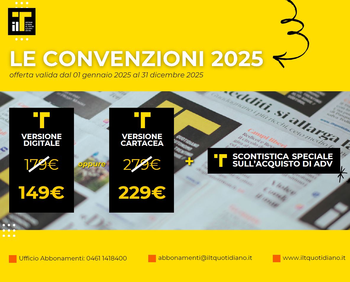 Circolari Eventi NotizieANCE Trento ha stipulato una convenzione con la società editrice Synthesis Srl per offrire alle nostre imprese la possibilità di sottoscrivere abbonamenti cartacei o digitali al quotidiano il T, con una scontistica esclusiva valida per il 2025 (salvo rinnovo).