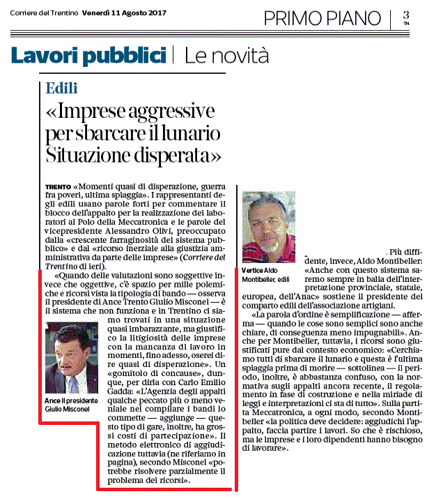 Intervento del presidente sul Corriere del Trentino del 11 agosto 2017