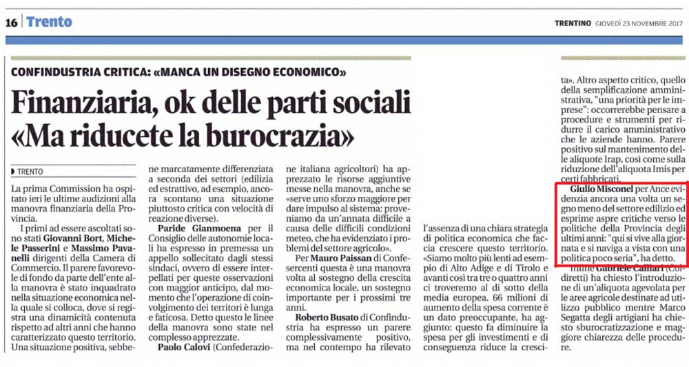 Intervento sul “Trentino” del 23 novembre 2017